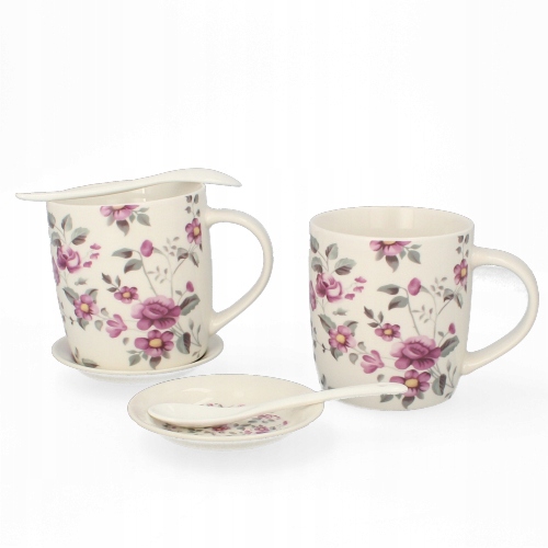 Komplet 2 kubków porcelanowych na kawę herbatę 340 ML spodkami i łyżeczkami