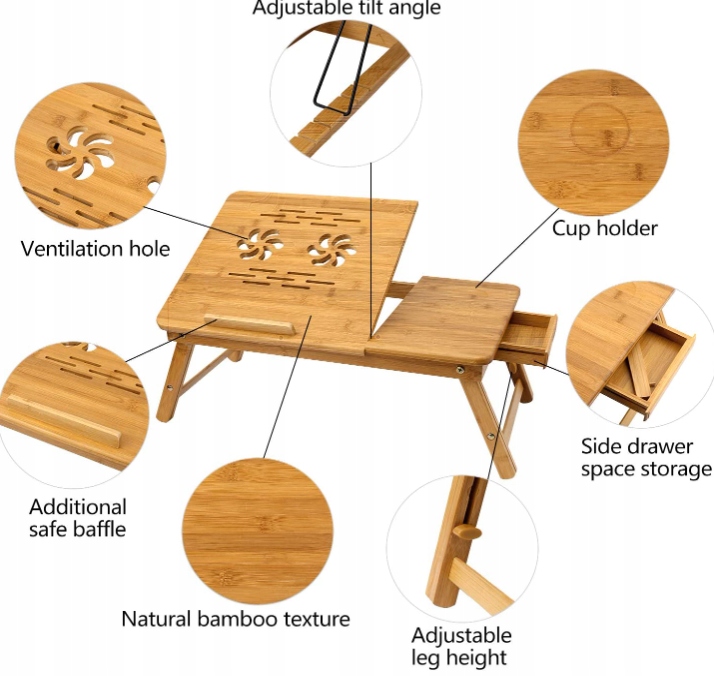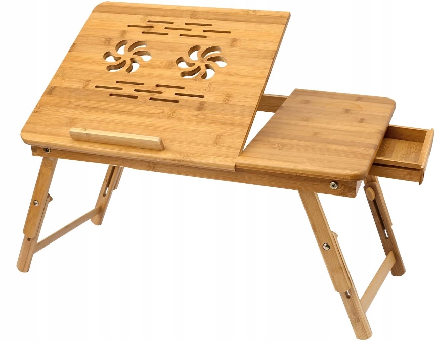 Bambusowe biurko na laptopa, regulowana taca na laptopa z odchylaną górną szufladą do surfowania, czytania, pisania i jedzenia
