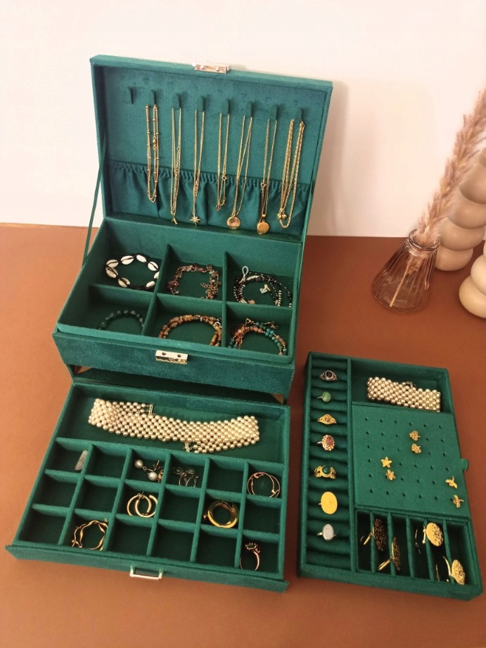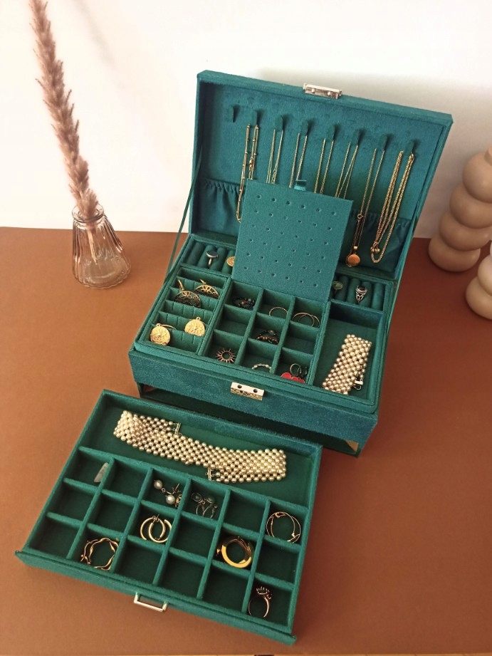 - Podzielona na sekcje i przegródki, dostosowane do przechowywania różnych typów biżuterii – pierścionków, naszyjników, bransoletek, kolczyków.